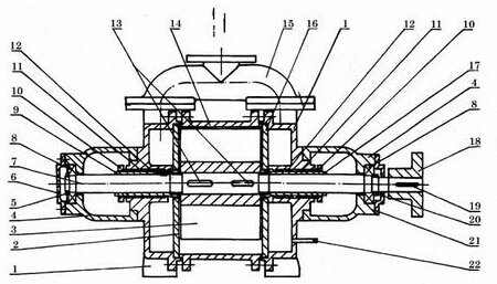 1.端蓋 2.后吸排氣園盤 3.葉輪 4.軸承架 5.園螺母 6.后軸承壓蓋 7.軸 8.軸承 9. 后軸套10.填料壓圈 11.填料 12.填料壓圈 13.平鍵 14.泵體 15.連通管 16.前吸排氣園盤 17.前 軸套 18.聯(lián)軸器具 19.平鍵 20.園螺母 21.前軸承壓蓋