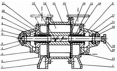 9. 填料壓蓋 10.填料壓圈 11.填料 12.平鍵 13. 葉輪 14.泵體 15.吸氣園盤 16.前軸套 17.前軸承架 18.前軸承壓蓋 19.平鍵 20.聯(lián)軸器 21.進(jìn)水管